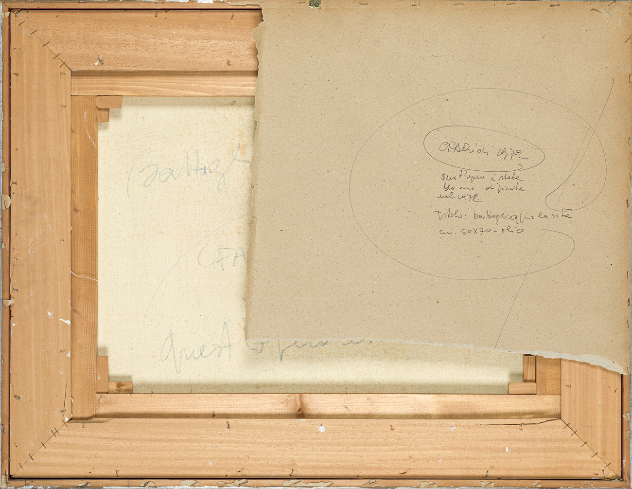 Firma, titolo, datazione, tecnica, misure e dichiarazione al retro del cartone protettivo