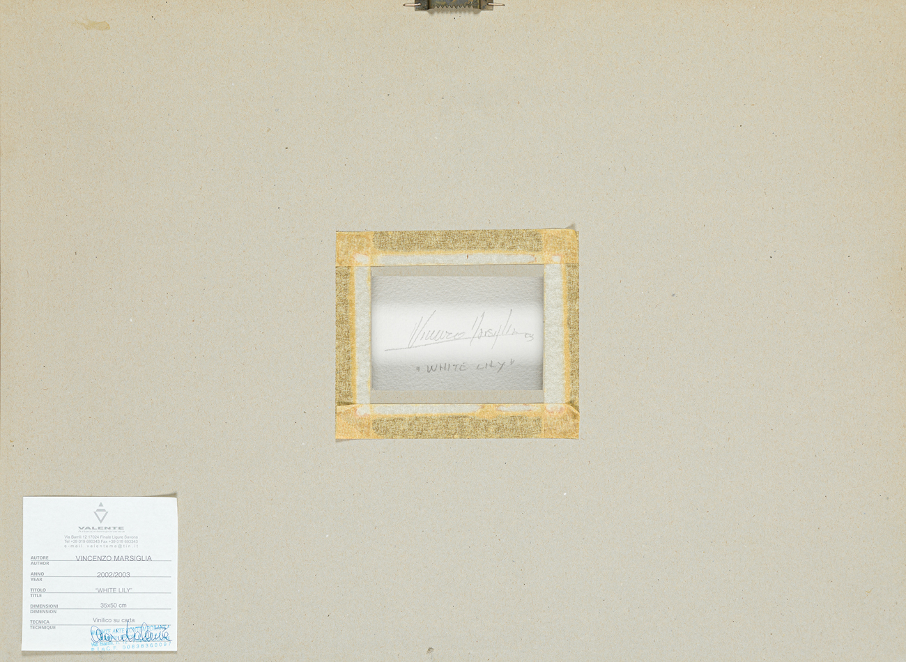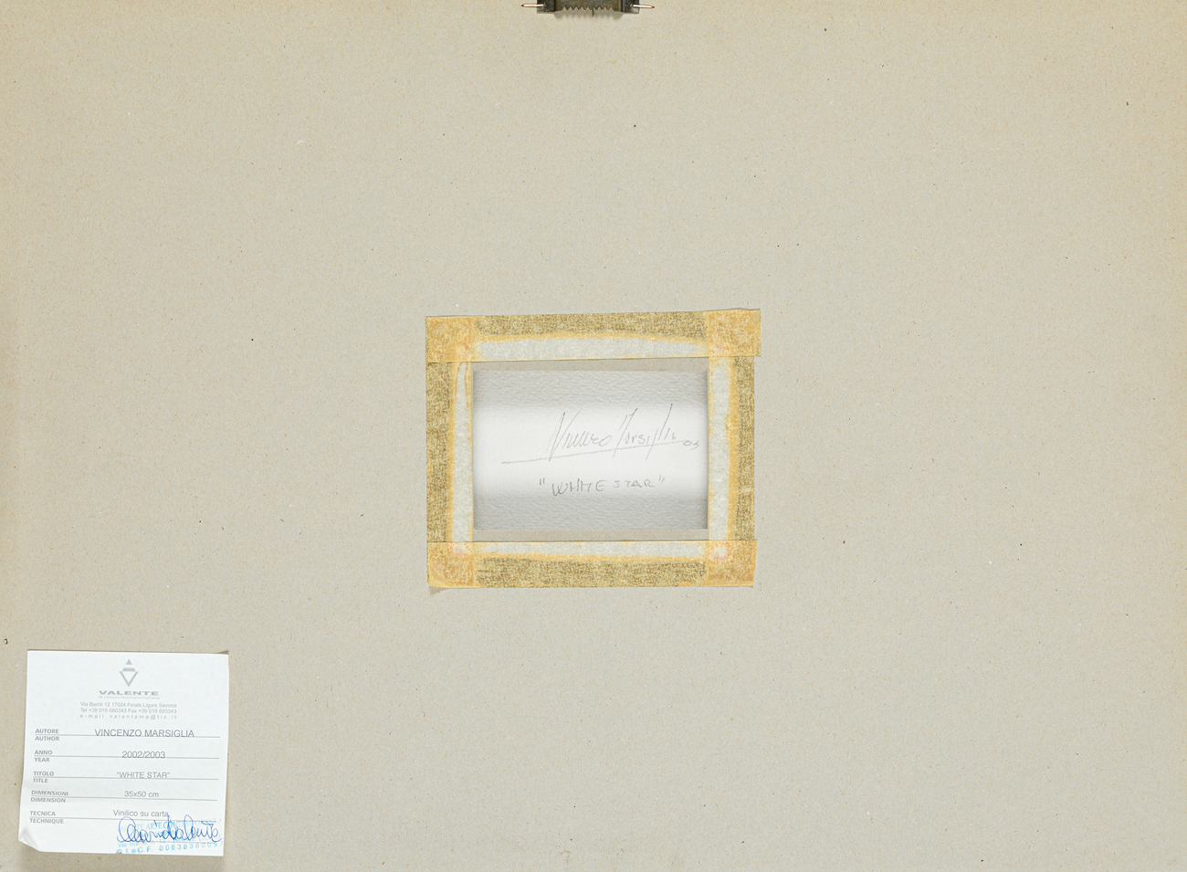 Etichetta della Galleria Valente Arte Contemporanea (SV) al retro del cartone protettivo