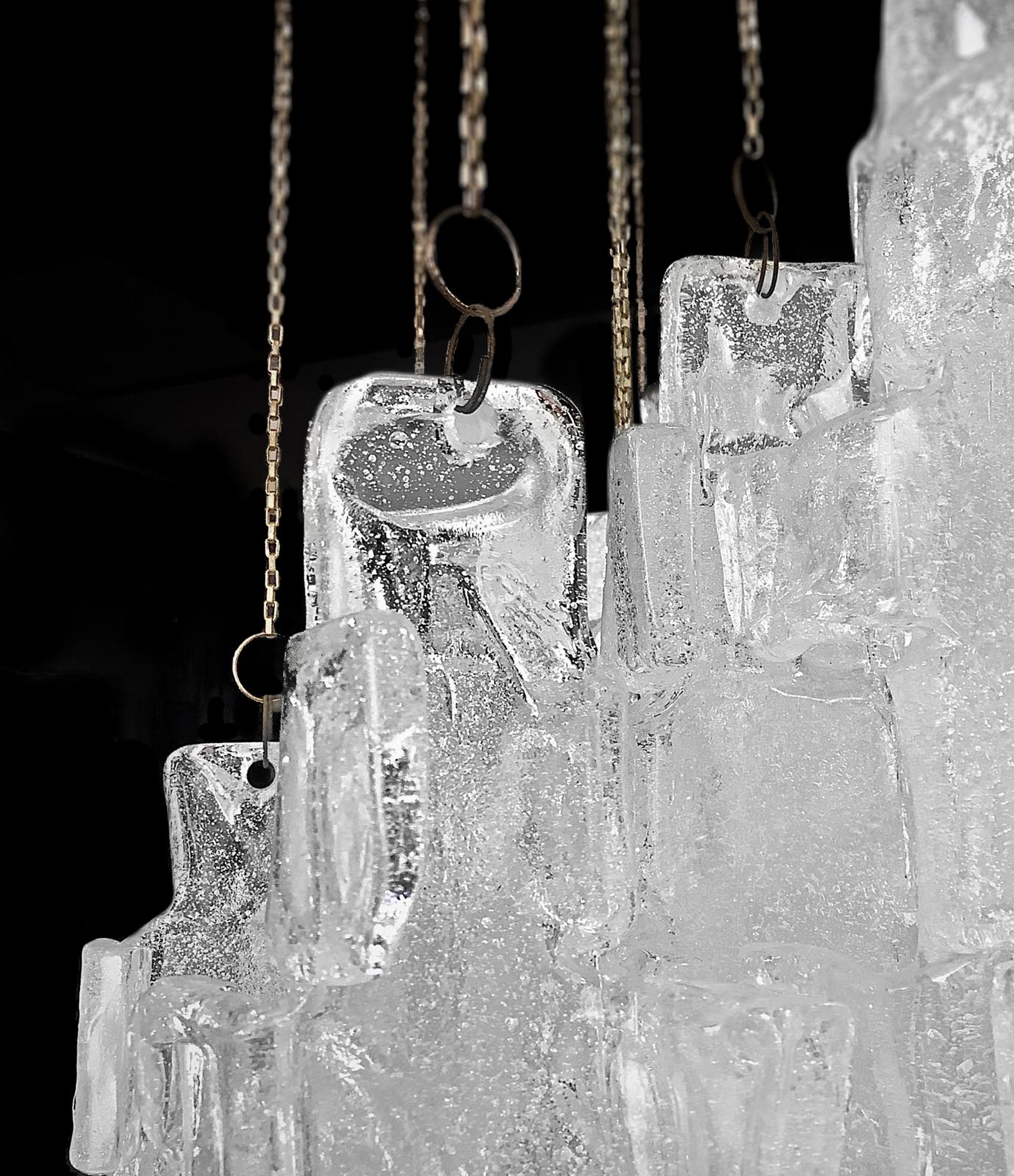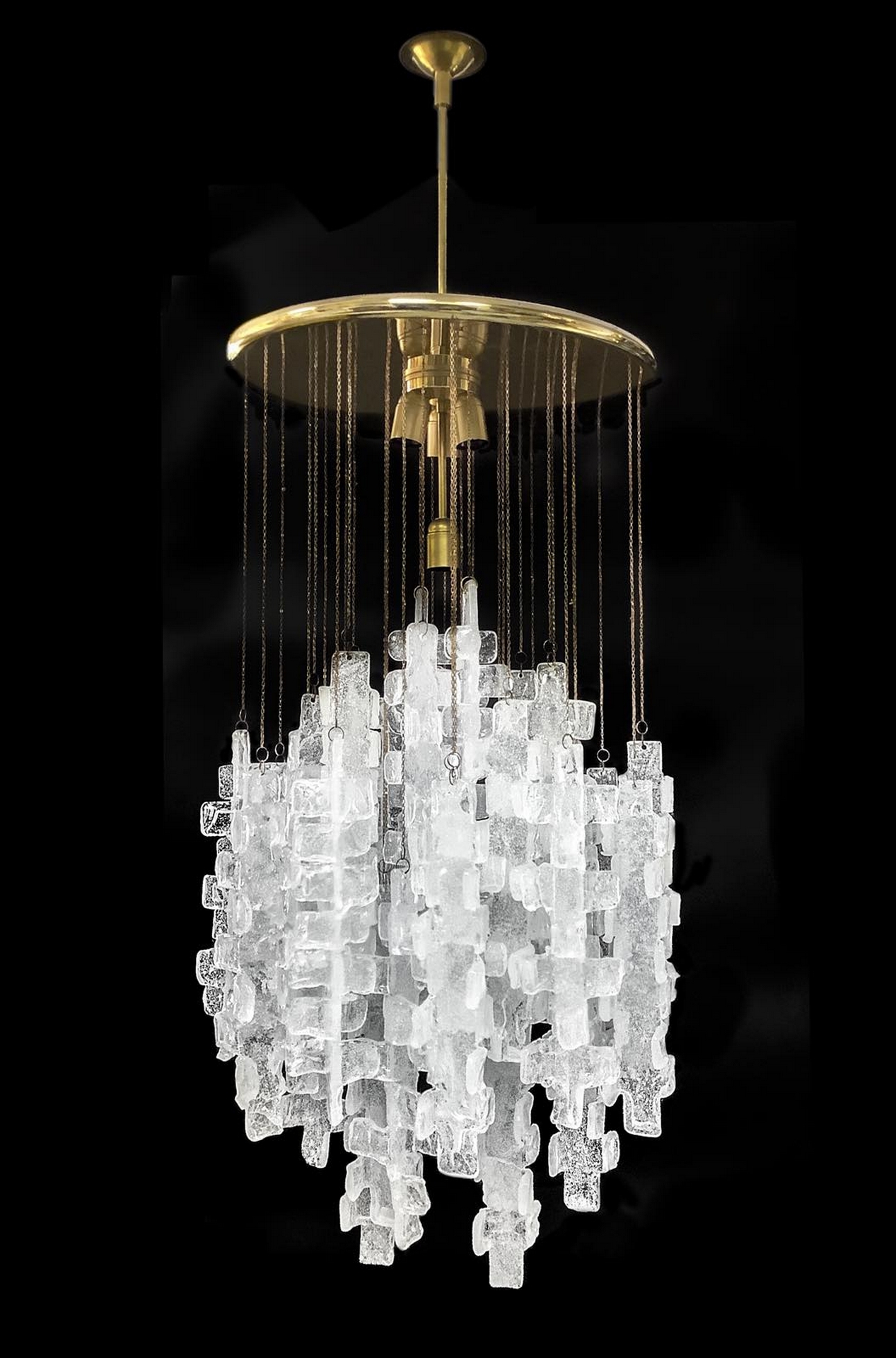 Lampadario in vetro, Murano, nello stile di A.D.Mazzega, ani '70. Con elementi in vetro pulegoso di forma geometrica, struttura in ottone lucido.. Quattro luci. H cm 130 (regolabile), larghezza cm 60