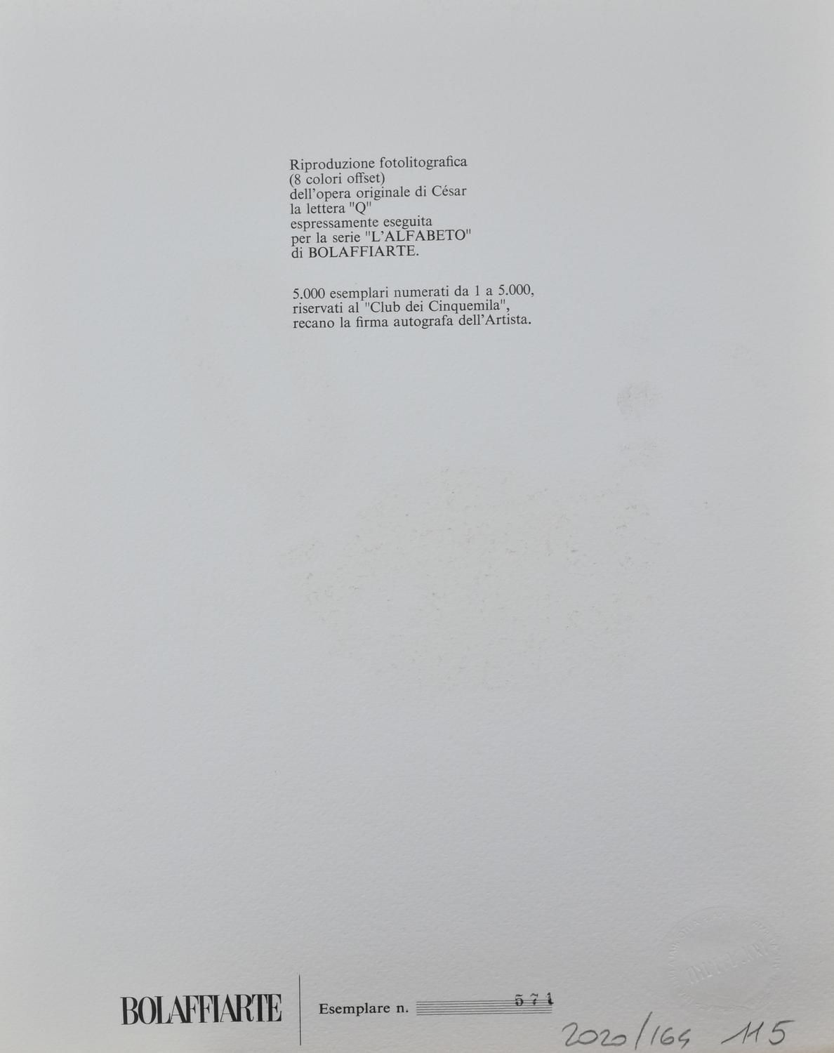 Cesar LETTERA Q riproduzione fotolitografica su cartoncino, cm 30x23,5; es....