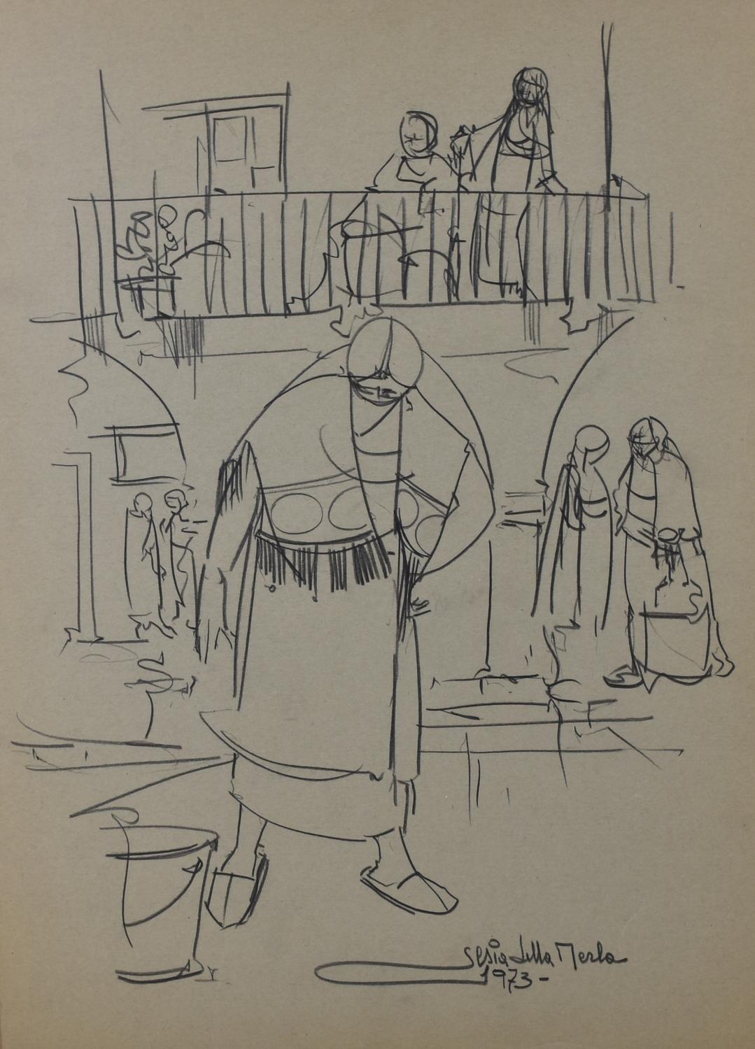Gianni Sesia della Merla DONNA ALLA FONTE pennarello su cartoncino, cm 57x42...