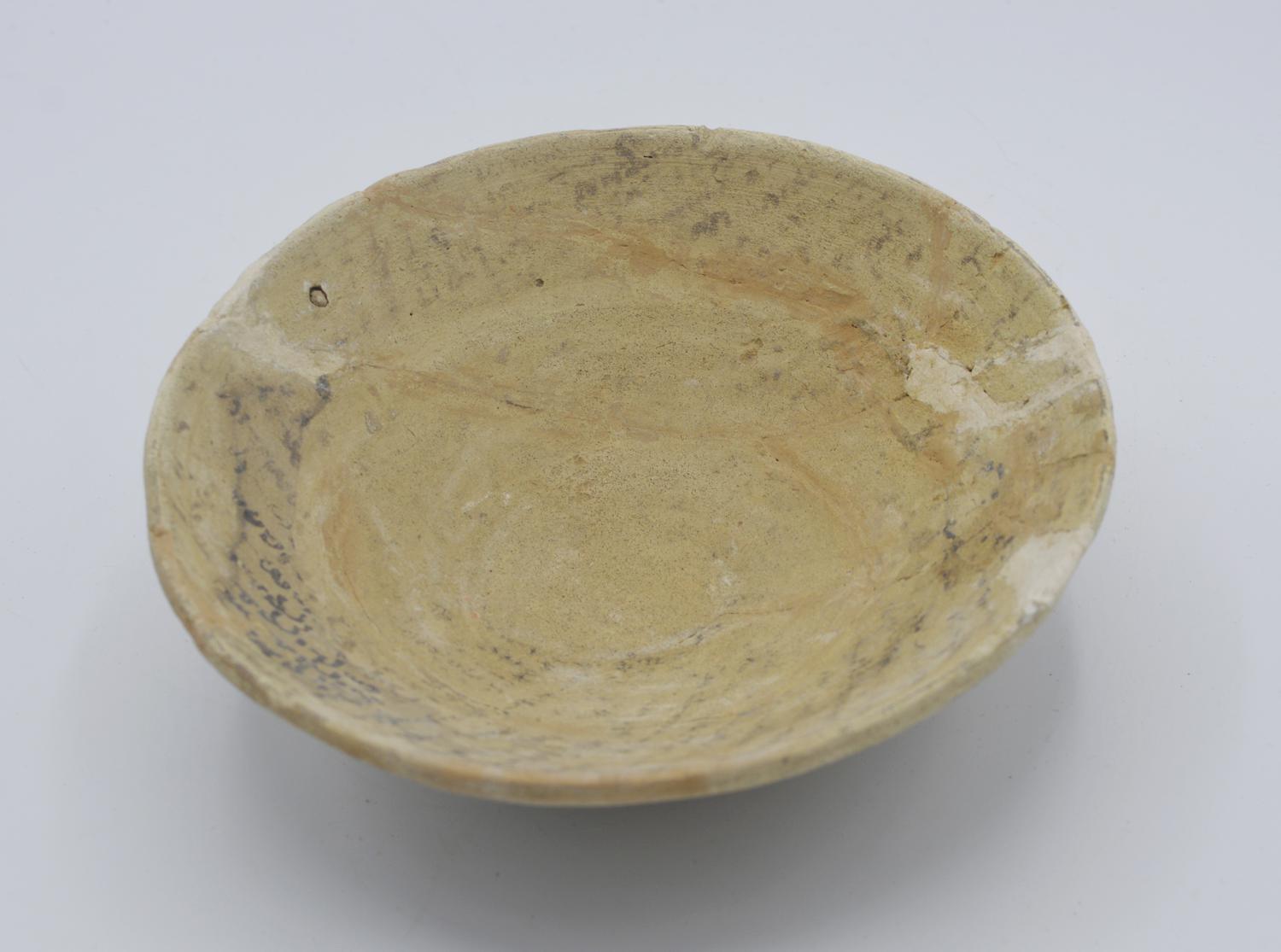 Coppa troncoconica con labbro arrotondato e fondo convesso; la parte interna della vasca è quasi completamente occupata da una lunga iscrizione in inchiostro nero