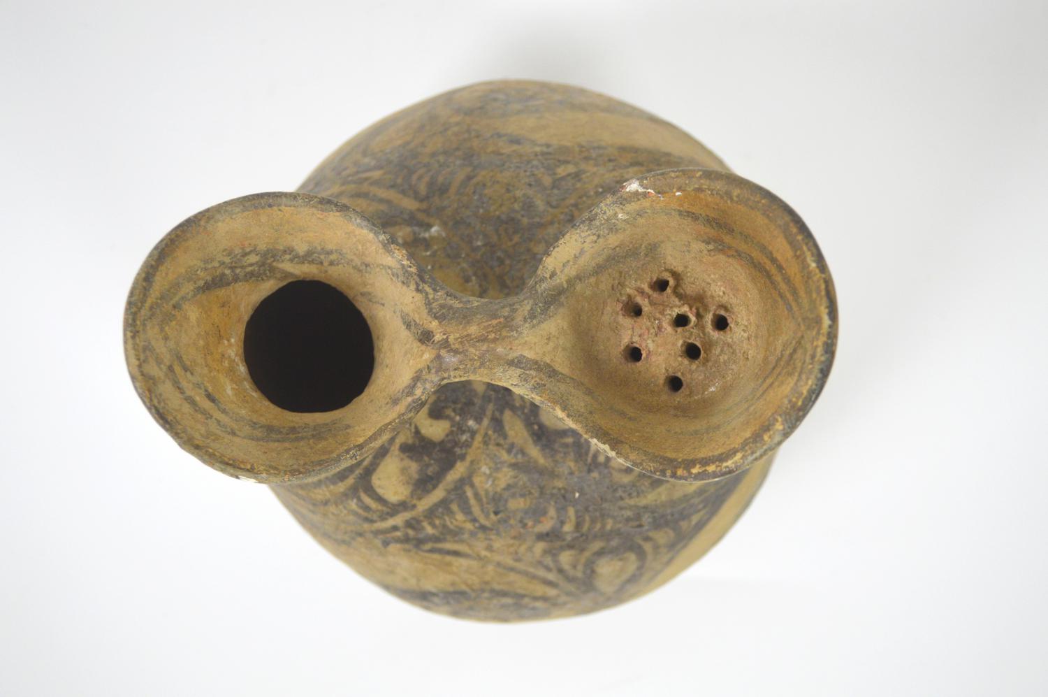 Vaso configurato come un otre stilizzato; nella parte superiore si trovano due bocchelli troncoconici obliqui riuniti da una piccola ansa a nastro; decorato in bruno a motivi geometrici e fitomorfi stilizzati