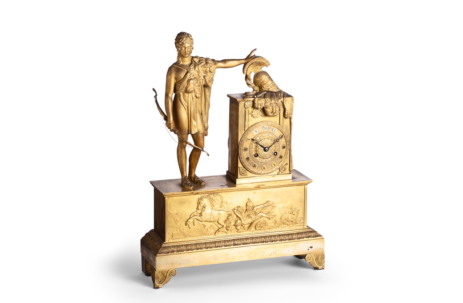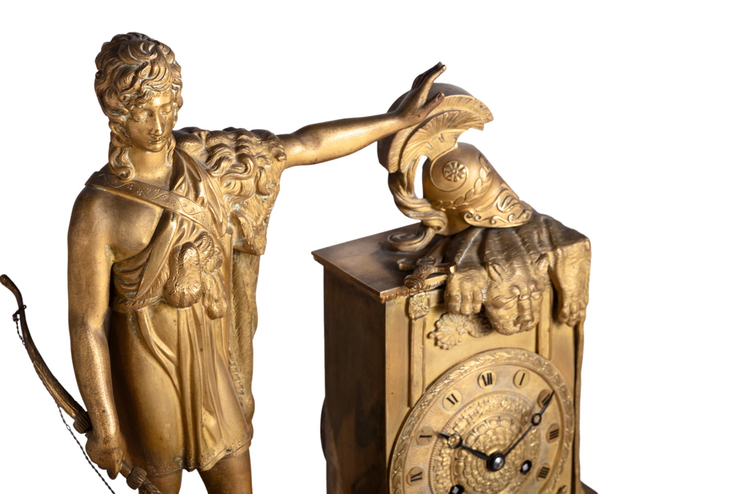 Pendola in bronzo dorato con David, che prima di andare a combattere il gigante Golia, rifiuta di armarsi, ornata sul fronte da fregio con il carro di Fetonte, inizi XIX secolo