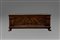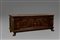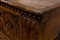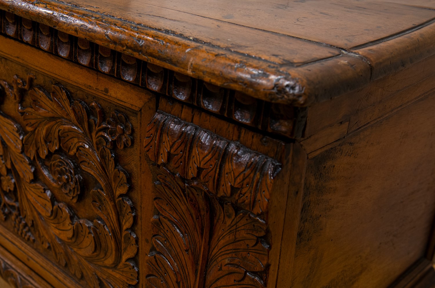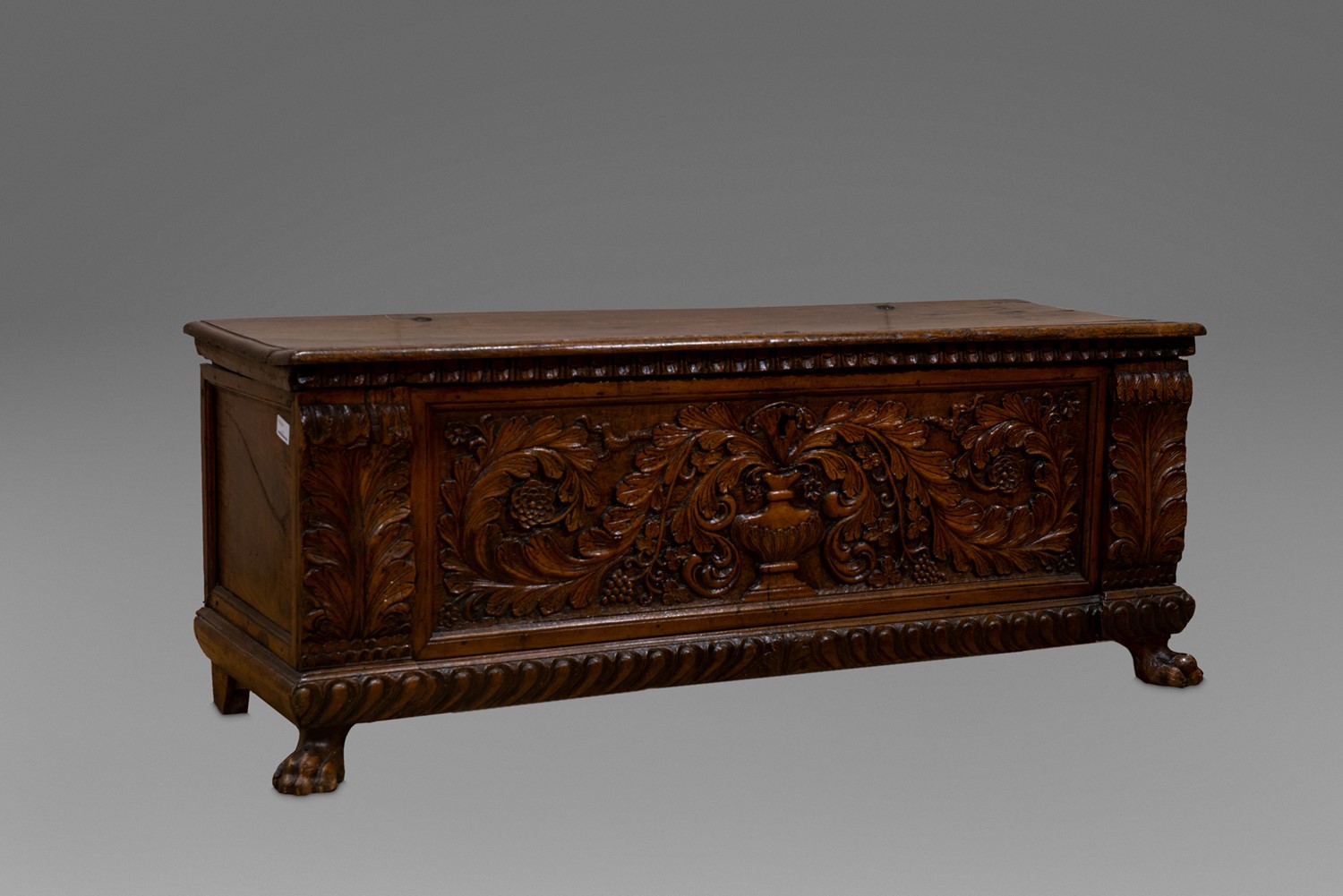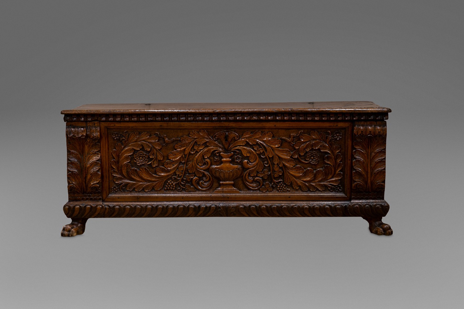 Bella cassapanca in noce riccamente intagliata, baccellata, con vaso sul fronte e zampe leonine, secolo XVI