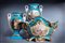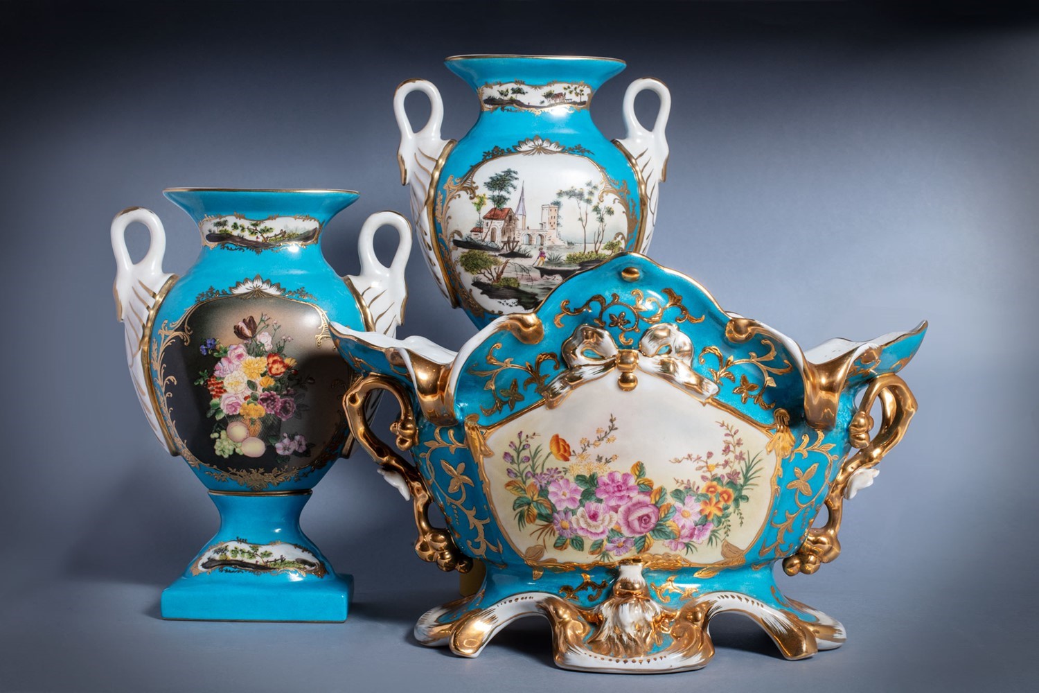 in porcellana a fondo blu con decori in oro e fiori entro riservein porcellana a fondo blu con decori in oro e fiori entro riserve