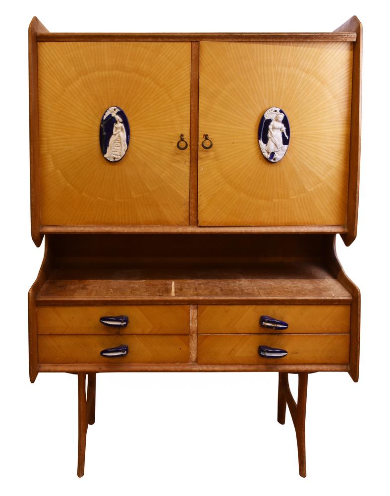 in legno biondo con maniglie e placche in ceramica di Albisola