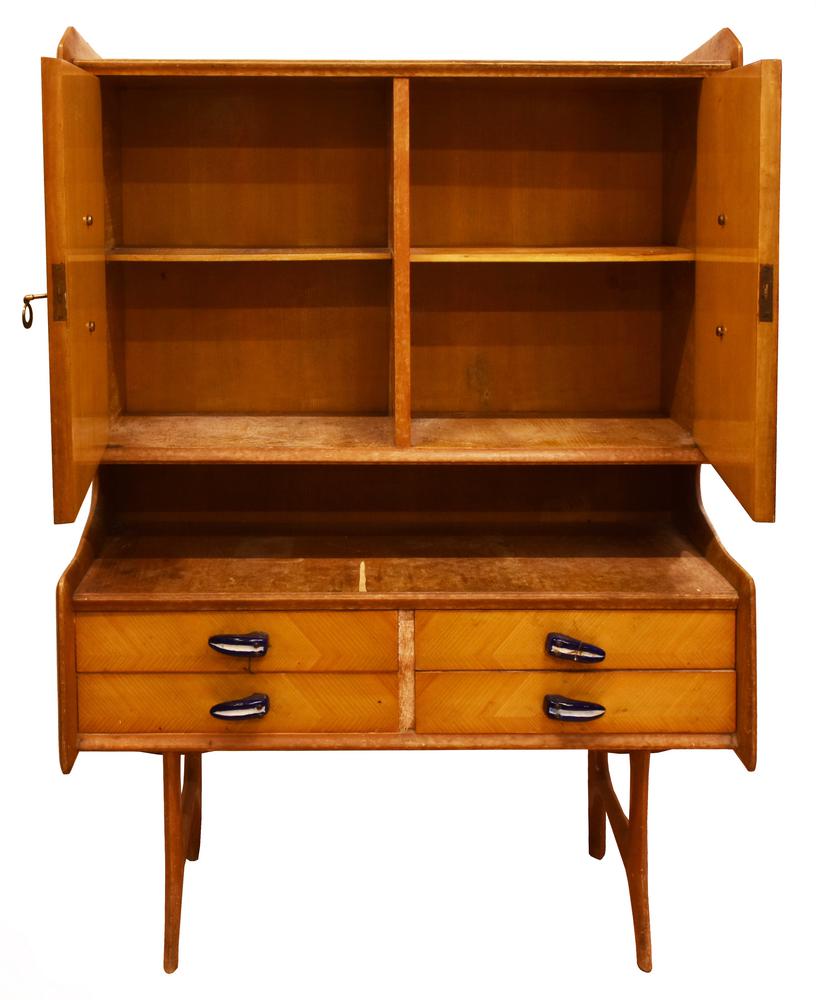 CREDENZA ANNI '50 in legno biondo con maniglie e placche in ceramica di...