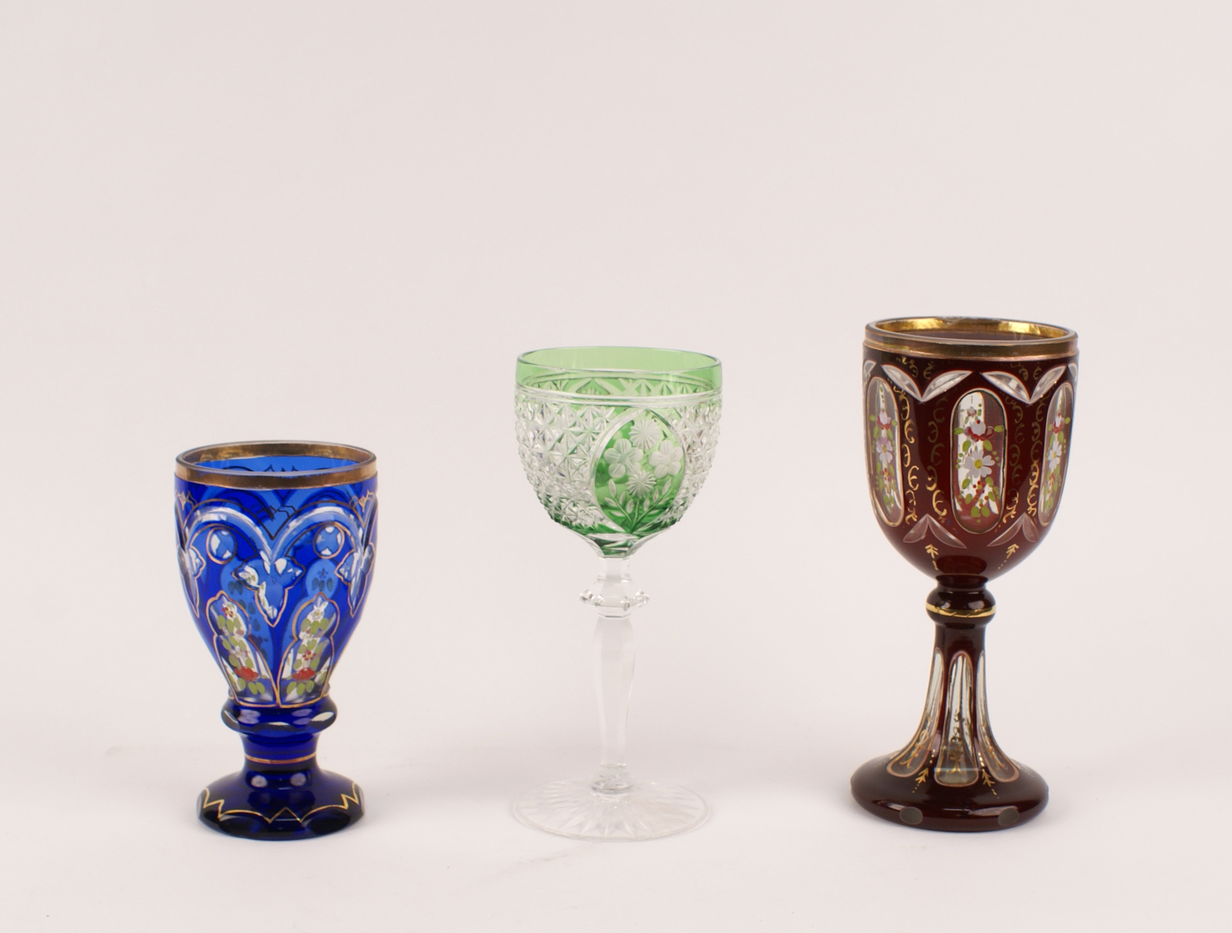 TRE BICCHIERI IN CRISTALLO MOLATO Boemia vecchia manifattura fogge e misure diverse