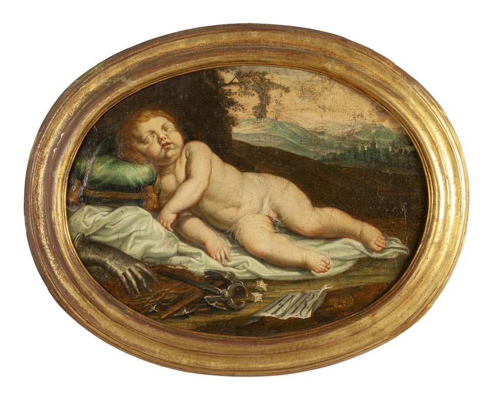 Scuola genovese sec.XVII "Gesù Bambino dormiente con i simboli della Passione" olio di forma ovale, cornice coeva in legno intagliato e dorato