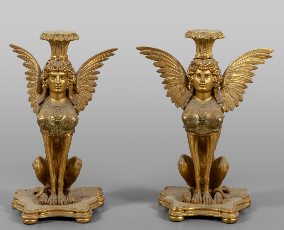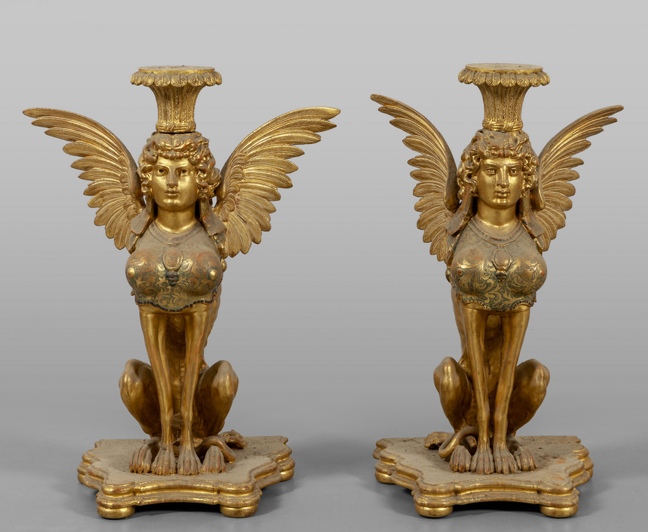 Coppia di grandi sfingi in legno intagliato e dorato, Toscana sec.XIX