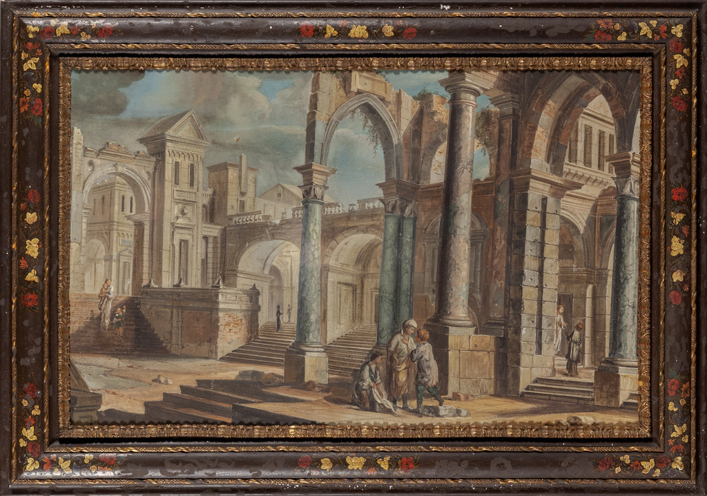 "Architettura fantastica" tempera su tela, splendida cornice dipinta in policromia e oro