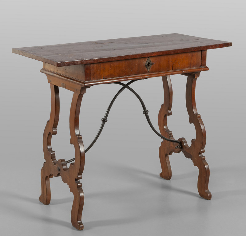 Piccola fratina Luigi XIV lastronata in noce e filettata in avorio, inizi sec.XVIII