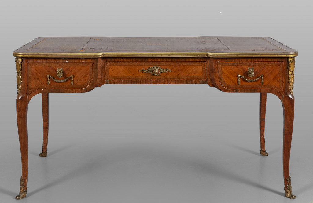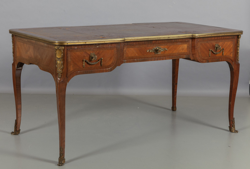 Scrivania Napoleone III impiallacciata in palissandro e legni vari, tre cassetti nella fascia, Francia sec.XIX