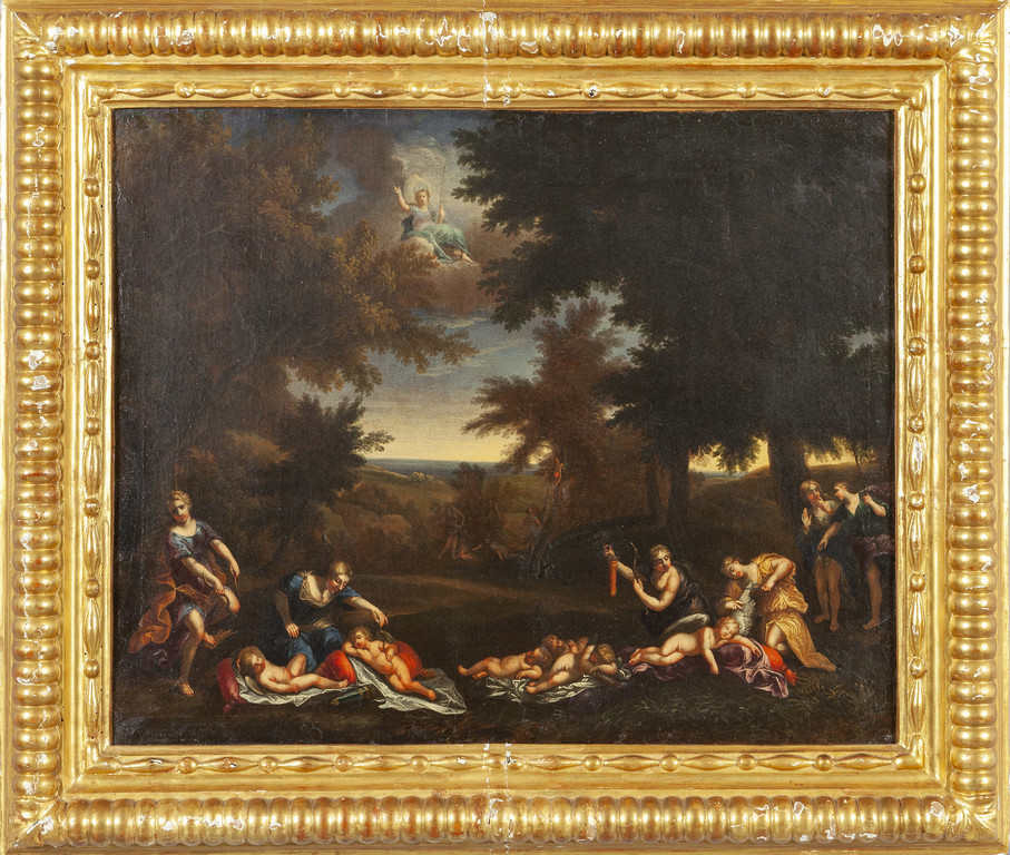 Scuola romana sec.XVII "Amorini che dormono derubati dalle ninfe di Diana" olio