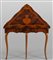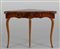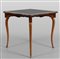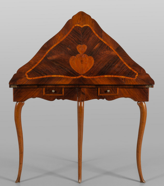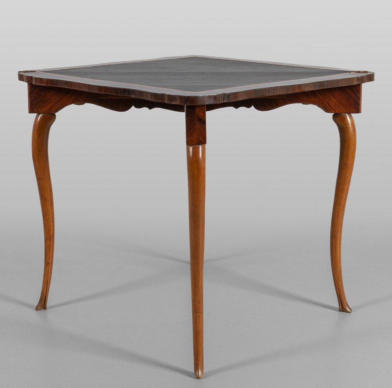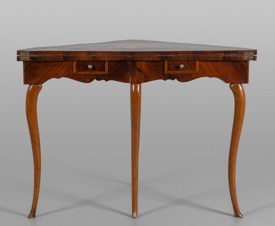 Tavolino da gioco apribile lastronato in palissandro ed intarsiato in legno di rosa con il classico motivo del quadrifoglio, gambe alte arcuate, due cassettini nella fascia, Genova sec.XVIII