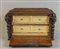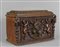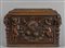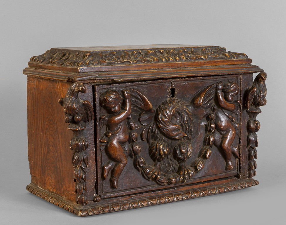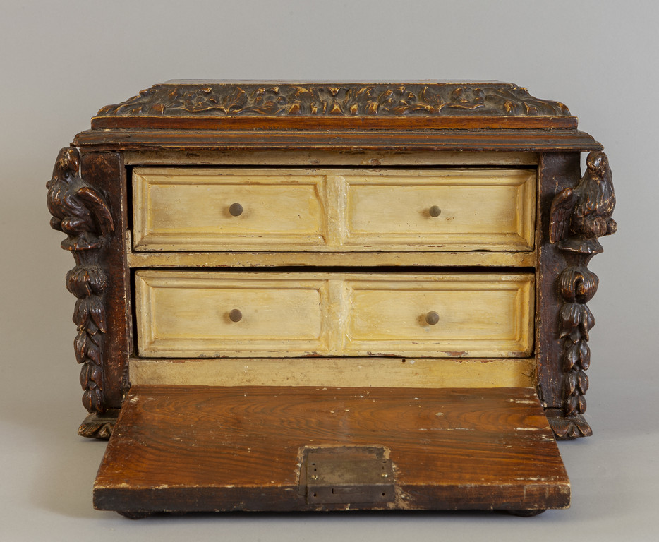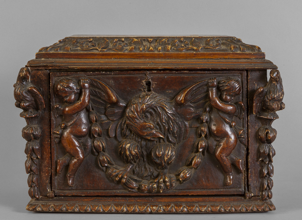 Forziere in legno finemente intagliato montanti terminanti con aquile , parte frontale raffigurante due putti che sostengono un'aquila, all'interno due cassetti, Italia del Nord sec.XVII