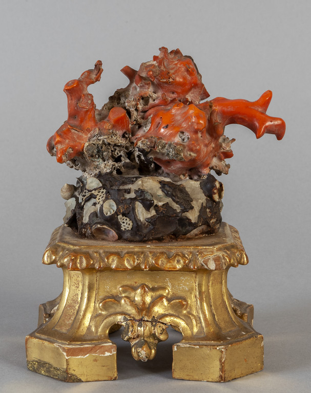Gruppo in corallo montato su base in legno intagliato e dorato, sec.XVIII