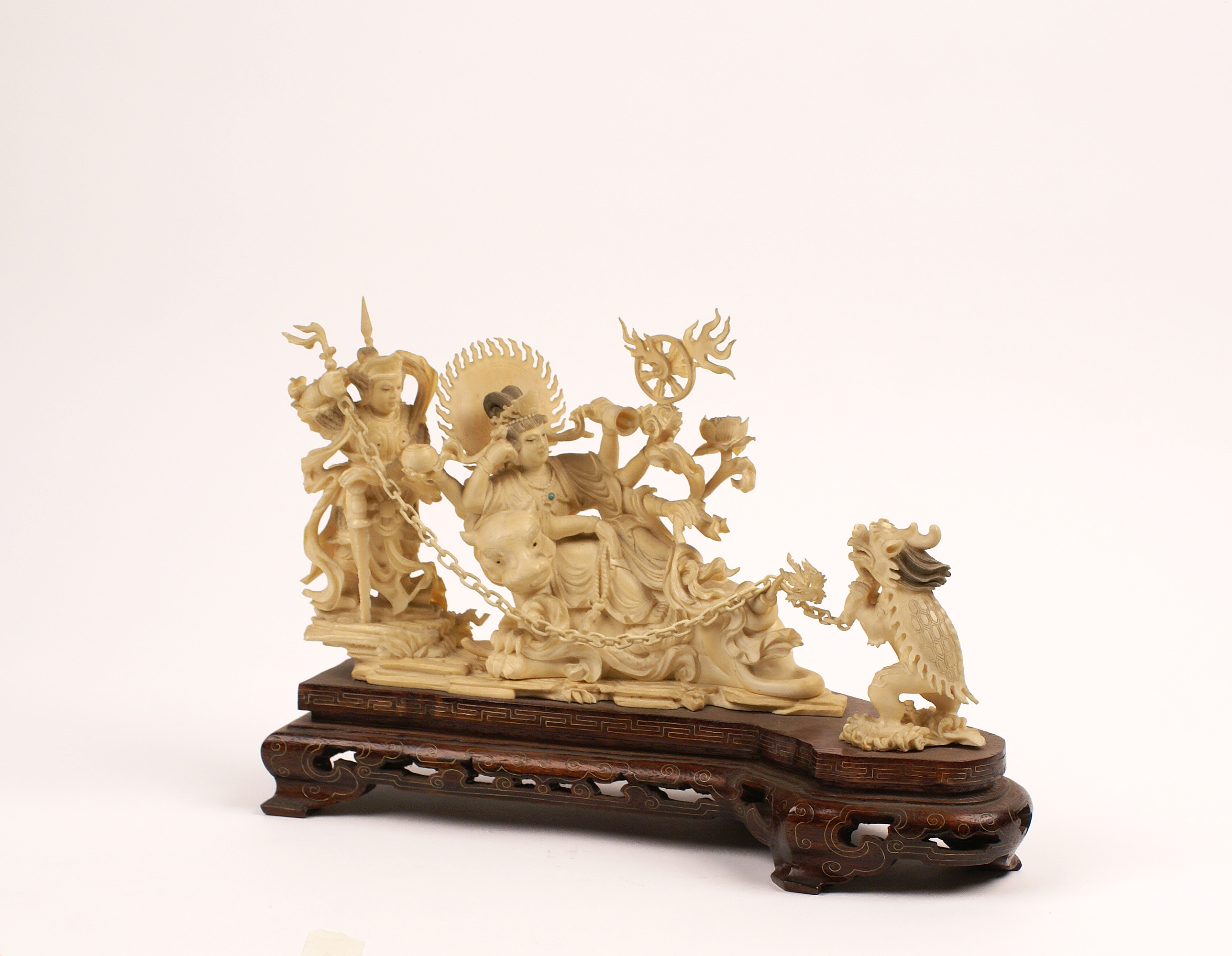 GRUPPO IN AVORIO Cina inizi del XX Sec. finemente scolpito ed intagliato a raffigurare una divinità orientale e poggiante su base sagomata in legno 20x29x12 cm.