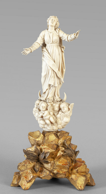 Assunta, scultura in avorio finemente scolpito, base in legno intagliato e dorato di epoca, Italia Centrale sec.XVIII