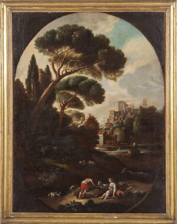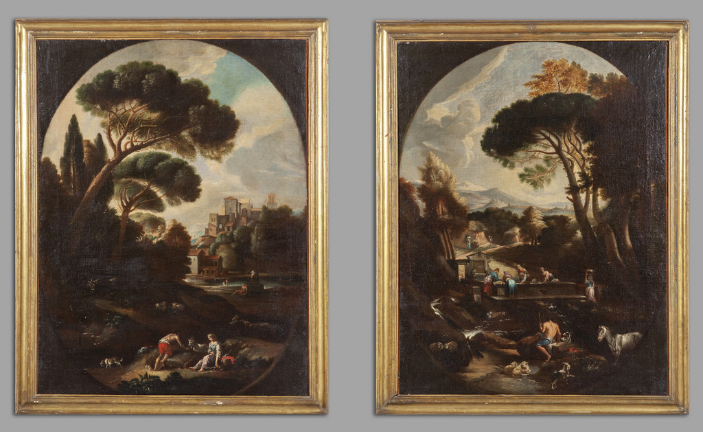 Scuola romana inizi sec.XVIII "Paesaggi con personaggi" coppia di olii, cornici coeve in legno intagliato e dorato