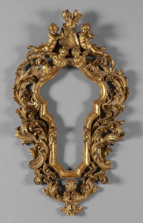 Cornice in legno finemente intagliato e dorato a volute con cinque putti nella cimasa, Italia Centrale sec.XVIII