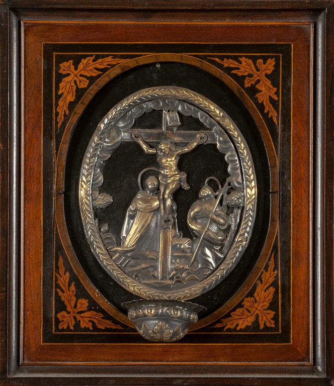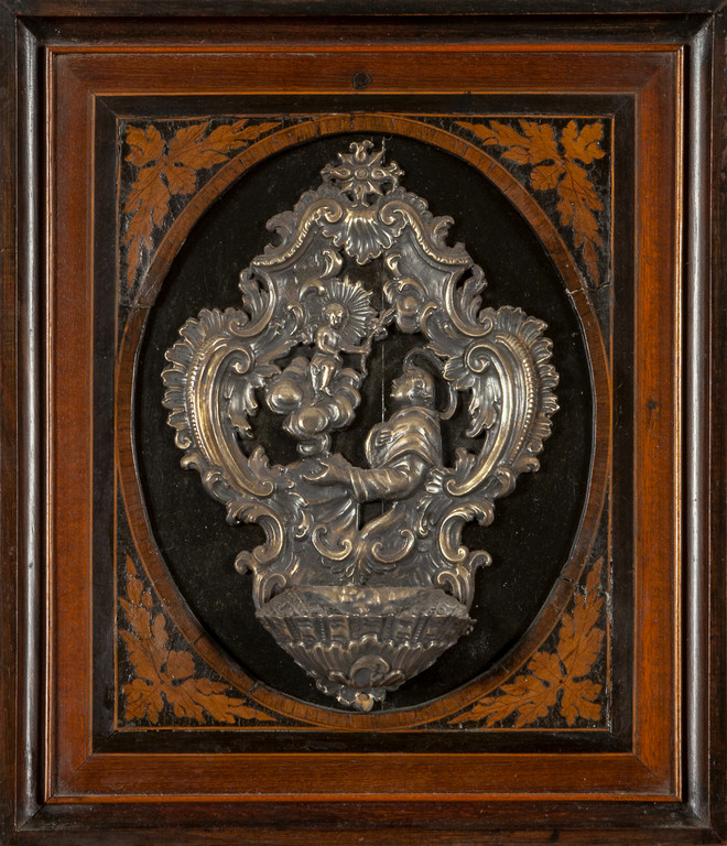 Due acquasantiere in argento raffiguranti Sant'Antonio e il Bambino, Punzone della Torretta anno 59 (cm.15x22) e Crocefisso con Santi (cm.15x21), cornici in legno finemente lastronato ed intarsiato della fine del secolo XVIII