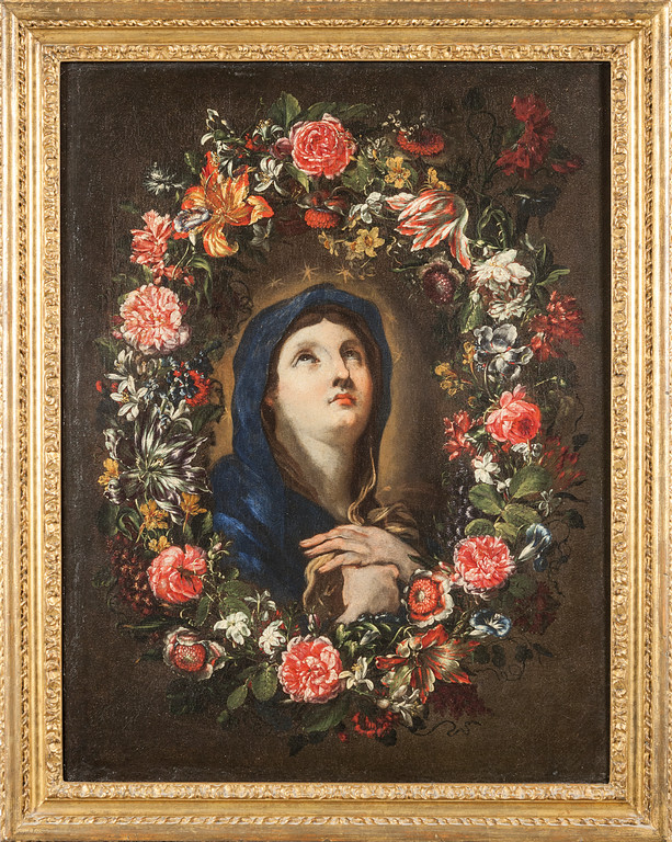 Scuola genovese sec.XVII "Madonna circondata da fiori" olio