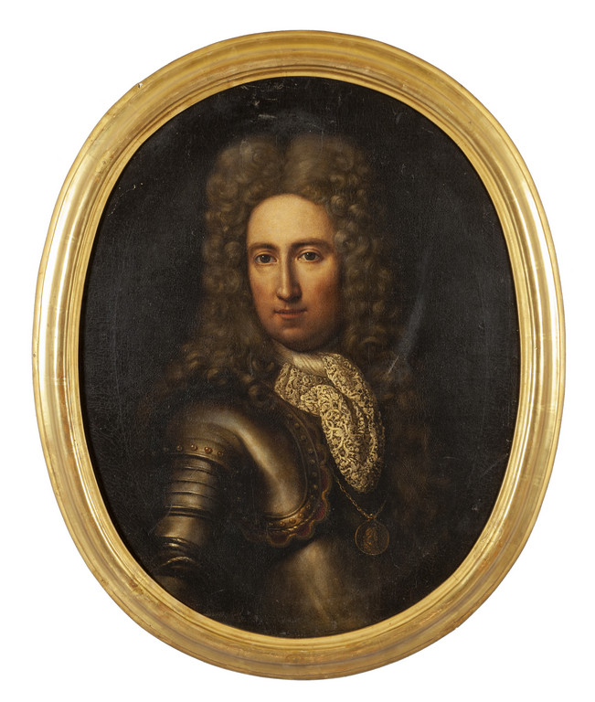 Scuola veneta sec.XVIII "Ritratto di condottiero con armatura" olio di forma ovale