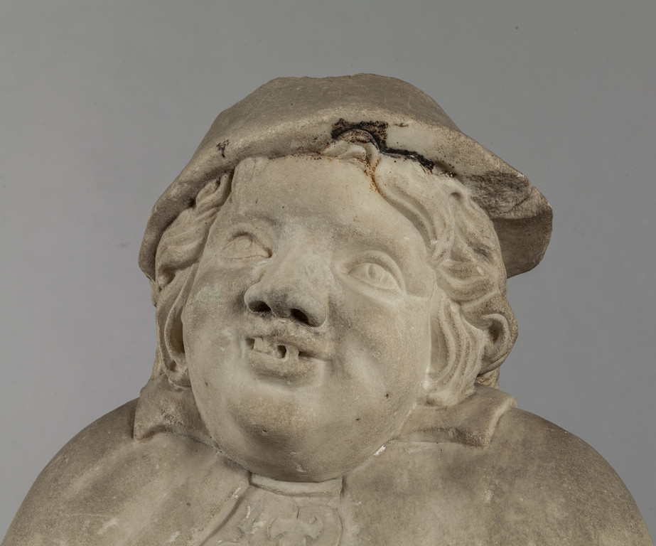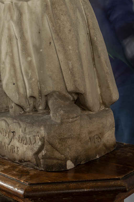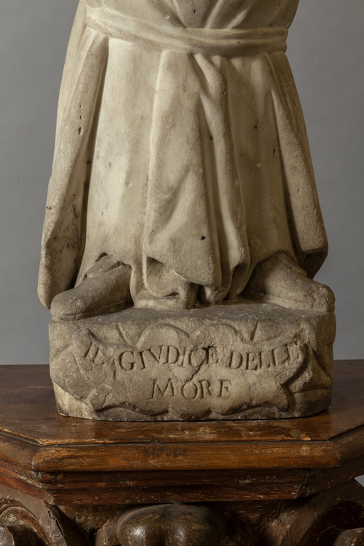 Il giudice delle more, grande scultura in marmo, Venezia sec.XVII(h.cm.103) poggiante su una base in legno intagliato relizzata da un antico cartiglio (h.cm74)