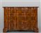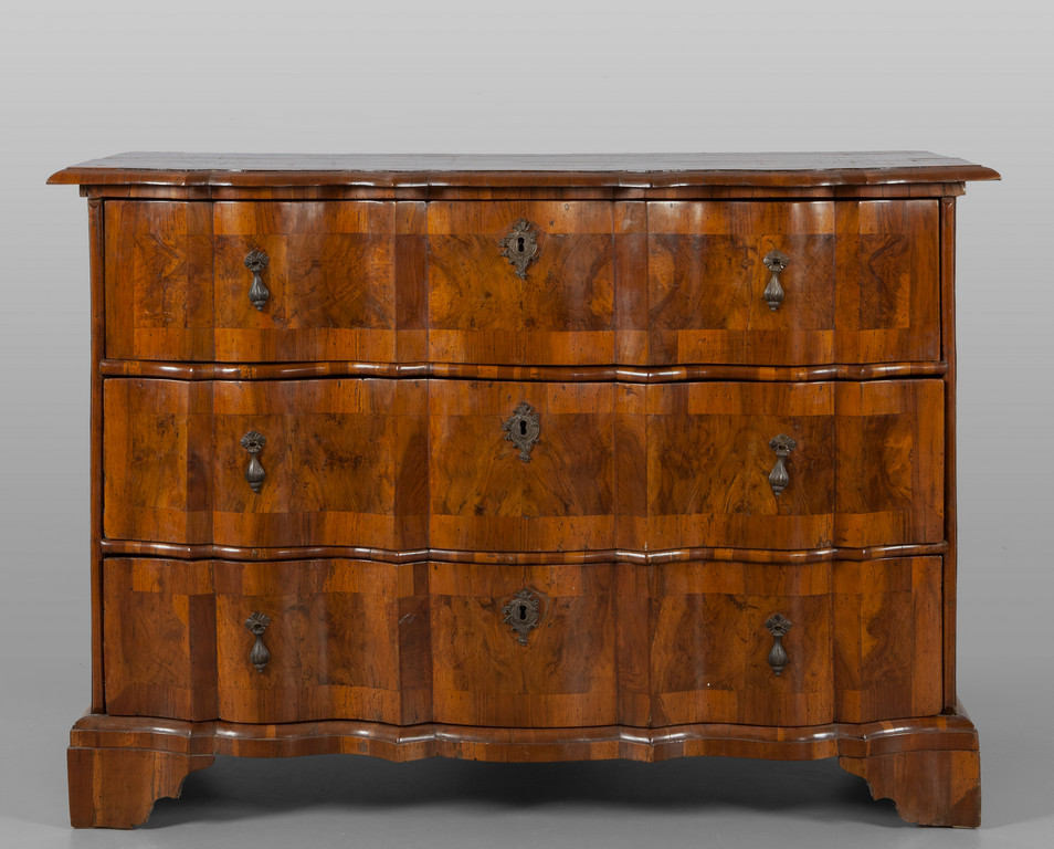 Comò Luigi XIV a tre cassetti movimentato sul fronte, lastronato in noce e radica di noce, Venezia I metà sec.XVIII