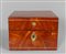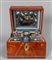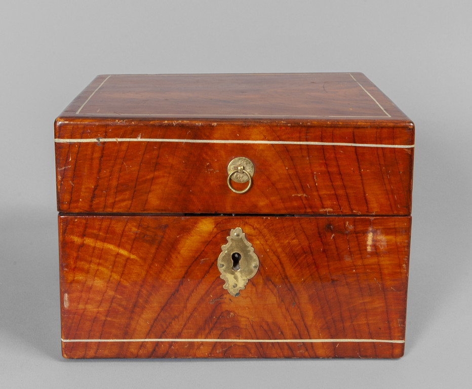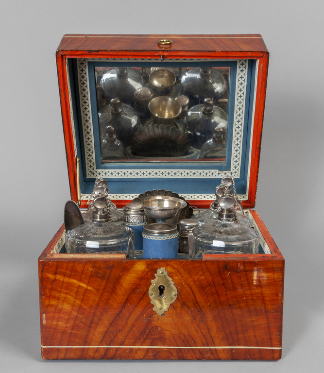 Necessaire da viaggio in vetro, argento e ceramica, nella sua custodia originale in legno, Nord Europa sec.XIX