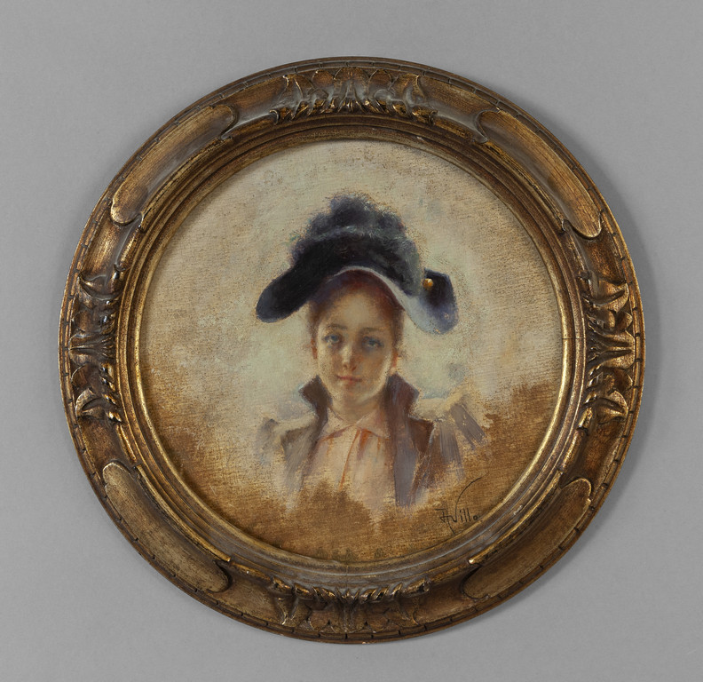 "Giovane donna con cappello piumato" olio, f.to in b.a ds., fine sec.XIX