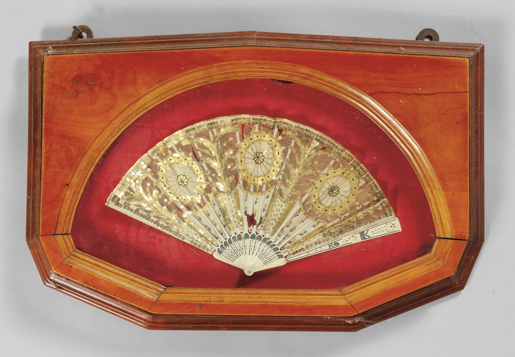 Ventaglio ricamato con perline dorate dentro la sua teca, inizi sec.XX