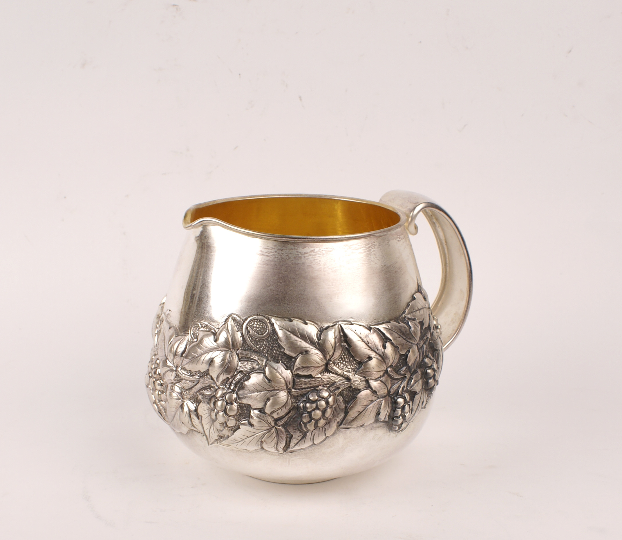 CARAFFA IN ARGENTO CON INTERNO IN VERMEIL manifattura italiana sbalzata a motivi di tralci di vite e grappoli d'uva, h. cm. 16 780 gr.