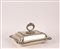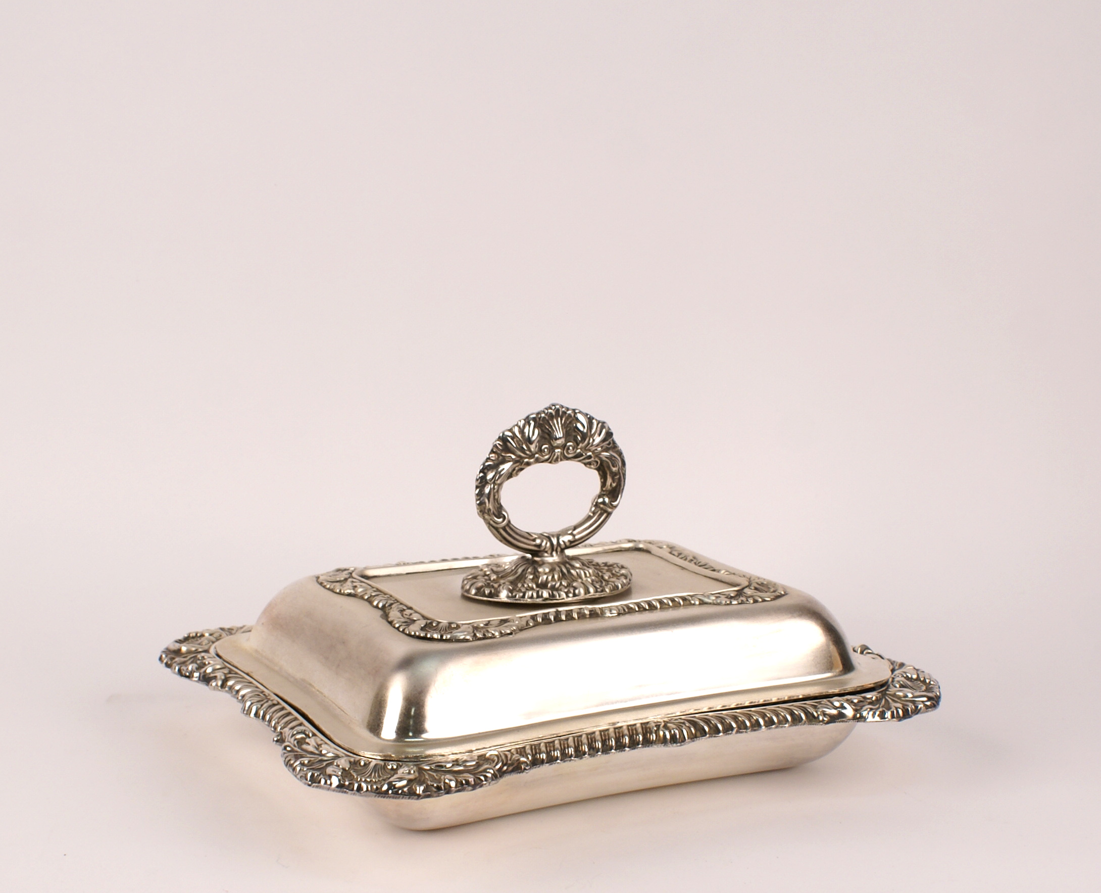 LEGUMIERA IN SHEFFIELD Inghilterra fine del XIX Sec. di forma rettangolare con profili sagomati e sbalzati a motivo di volute, presa a baionetta 16x30x23 cm.