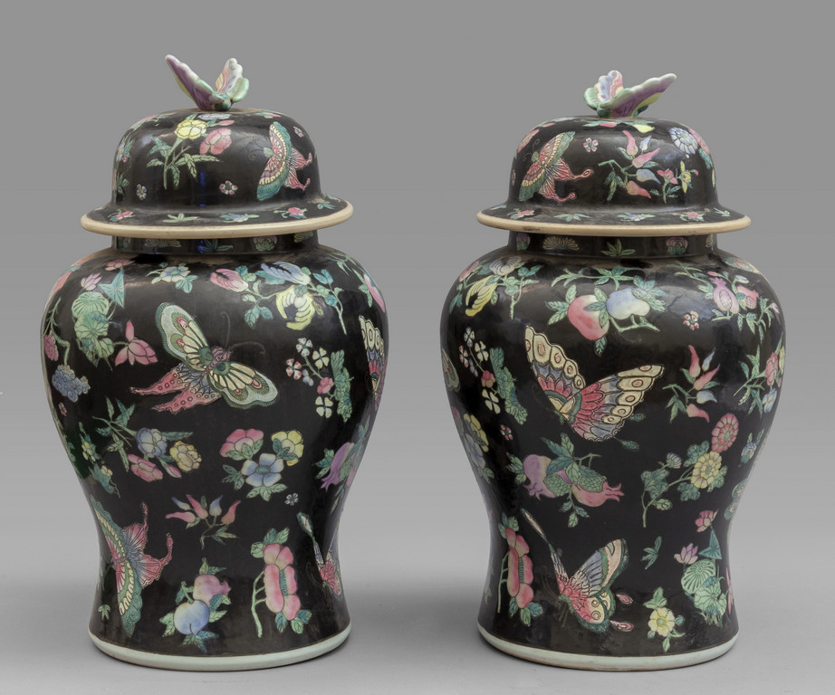 Coppia di grandi potiches in porcellana d Cina, Famiglia Nera, con coperchi sormontati da farfalla