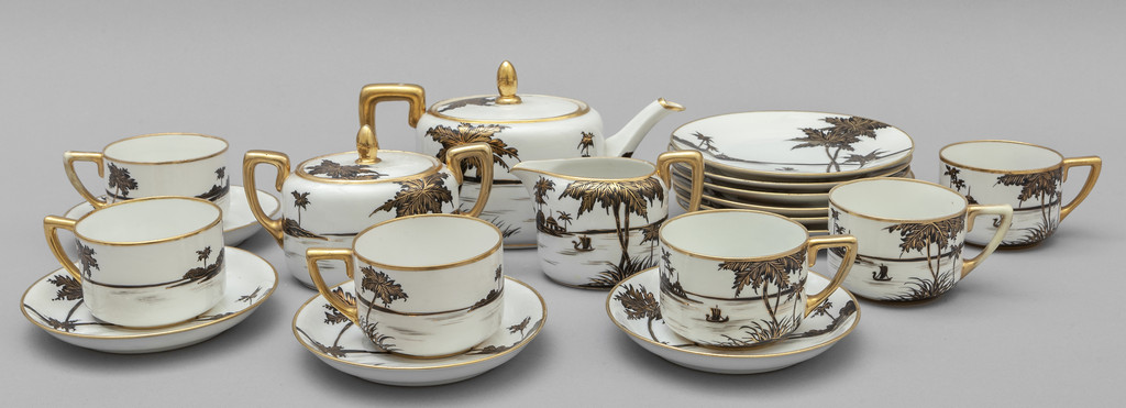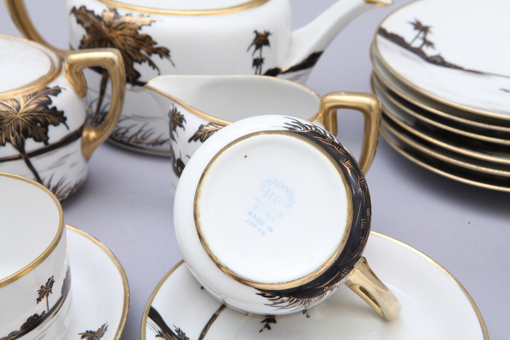 Servizio in porcellana da caffè per sei decorato a cineserie in nero e oro, marcato, Giappone inizi sec.XX