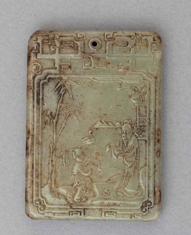 Placca in giada Celadon con raffigurazione di saggio con servitore, nel retro iscrizione