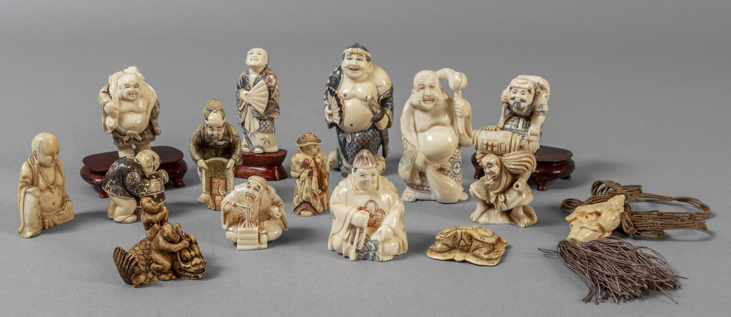 Quattordici statuette in avorio raffiguranti personaggi ed una raffigurante tartaruga, Giappone fine sec.XIX