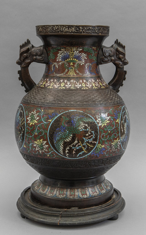 Vaso cloisonnè in bronzo con manici a forma di animali, Cina sec.XIX