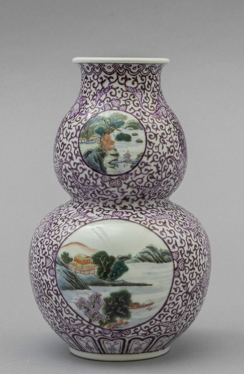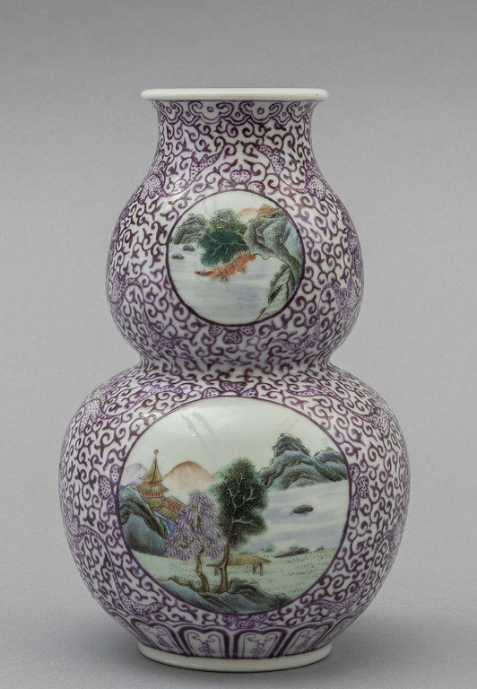 Vaso in porcellana policroma a forma di pera riserve dipinte con personaggi, marcato alla base Cina sec.XIX