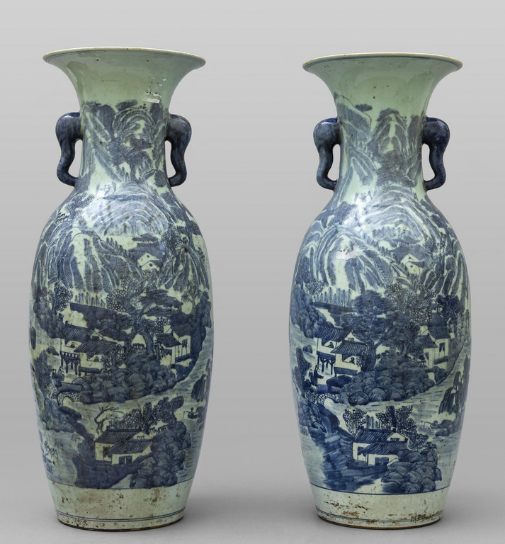 Coppia di vasi in porcellana bianca e blu decorati con paesaggi di montagna, Cina sec.XIX