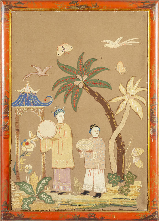 Paesaggio orientale, pannello con riporti in stoffa, cornice in legno laccato con paesaggini, Cina sec.XIX