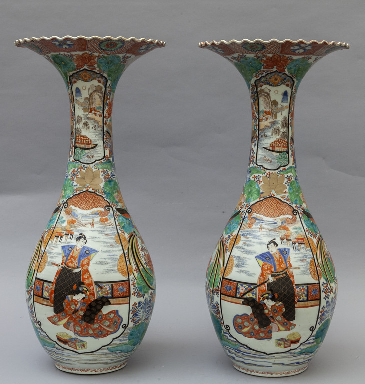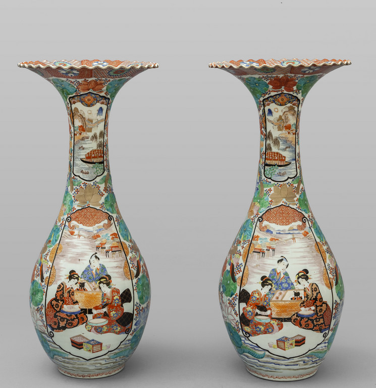 Coppia di vasi in porcellana policroma decorati con gheishe e samurai, Giappone sec.XIX