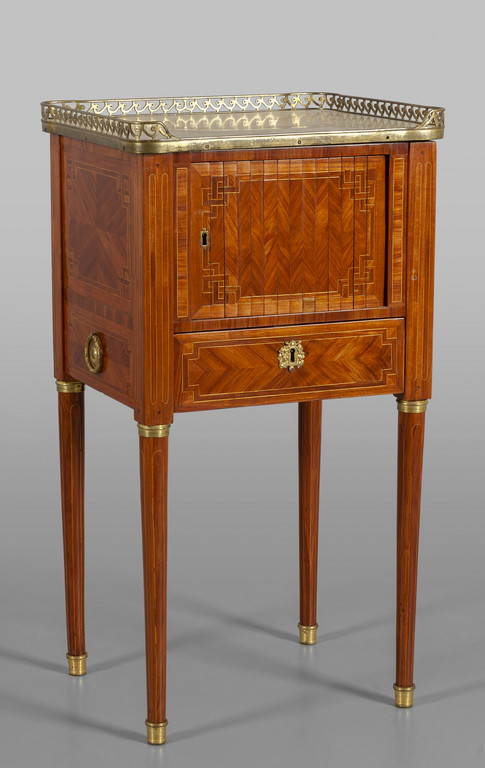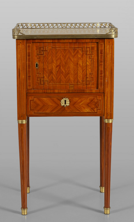Mobiletto da centro Luigi XVI lastronato in legni vari, gambe alte, fronte con serrandina, piano in marmo con ringhierina, Torino sec.XVIII