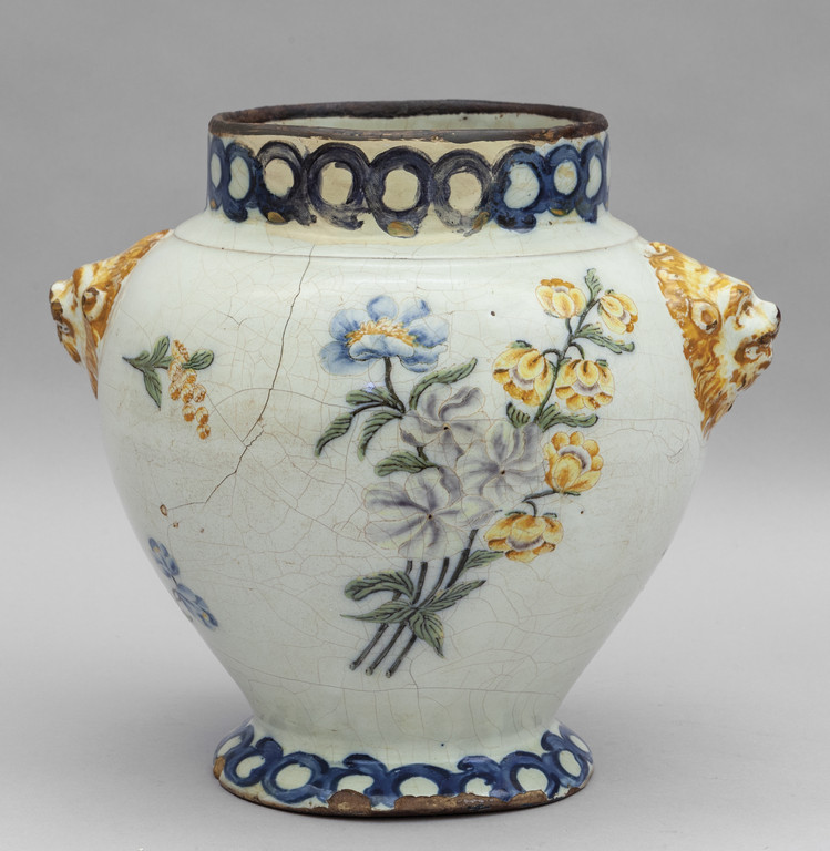 Vaso in ceramica policroma, decorazione a fiori su fondo bianco, mascheroni ai lati, Torino sec.XVIII