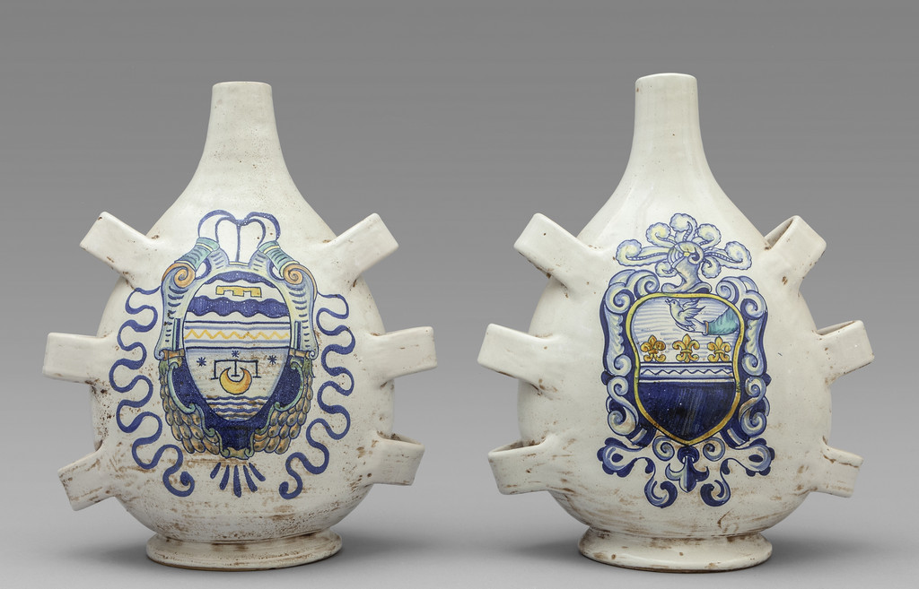 Coppia di fiasche in ceramica bianca decorate con stemmi in policromia, Deruta sec.XX