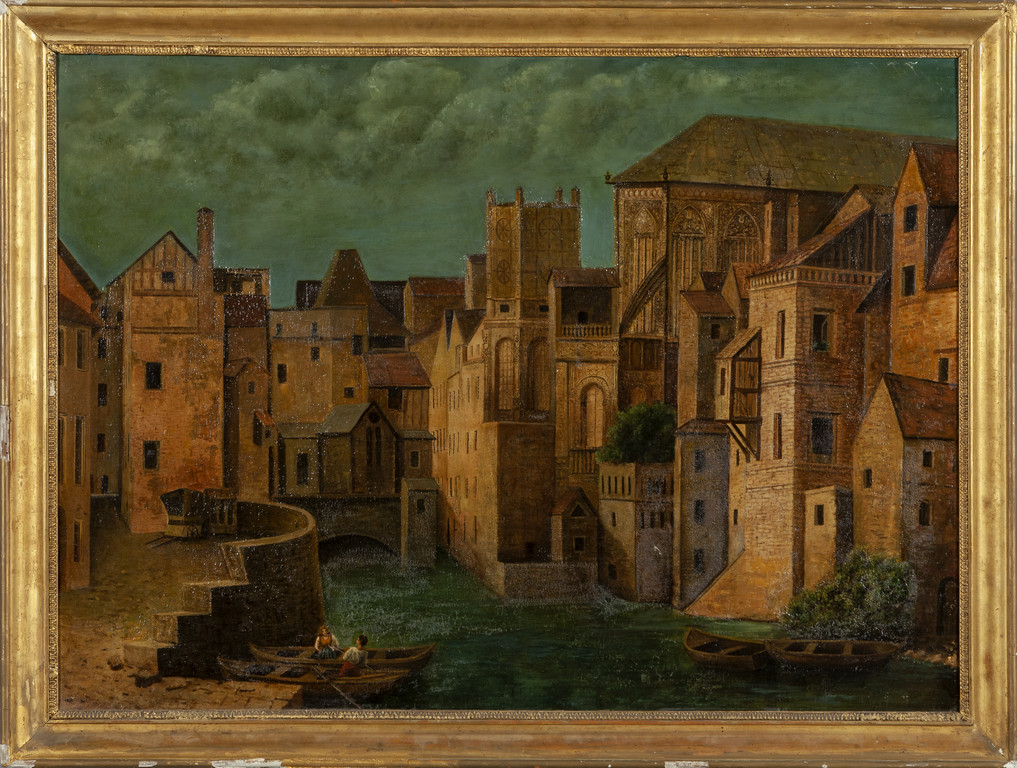 Lotto 0568 | "Città sul fiume con figure" olio<br>cm. 114x85