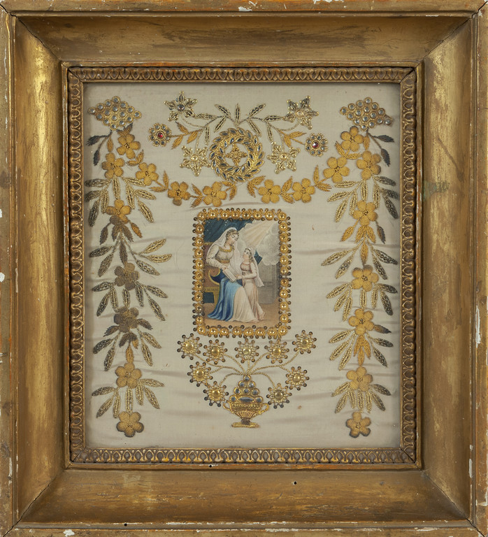 Antico ricamo raffigurante l'educazione della Vergine, cornice dorata, sec.XIX